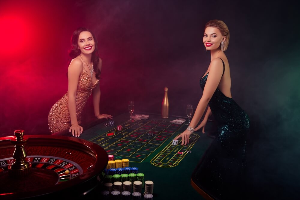 Photo,Two,Seductive,Lady,Playing,Poker,On,Casino,Table,With